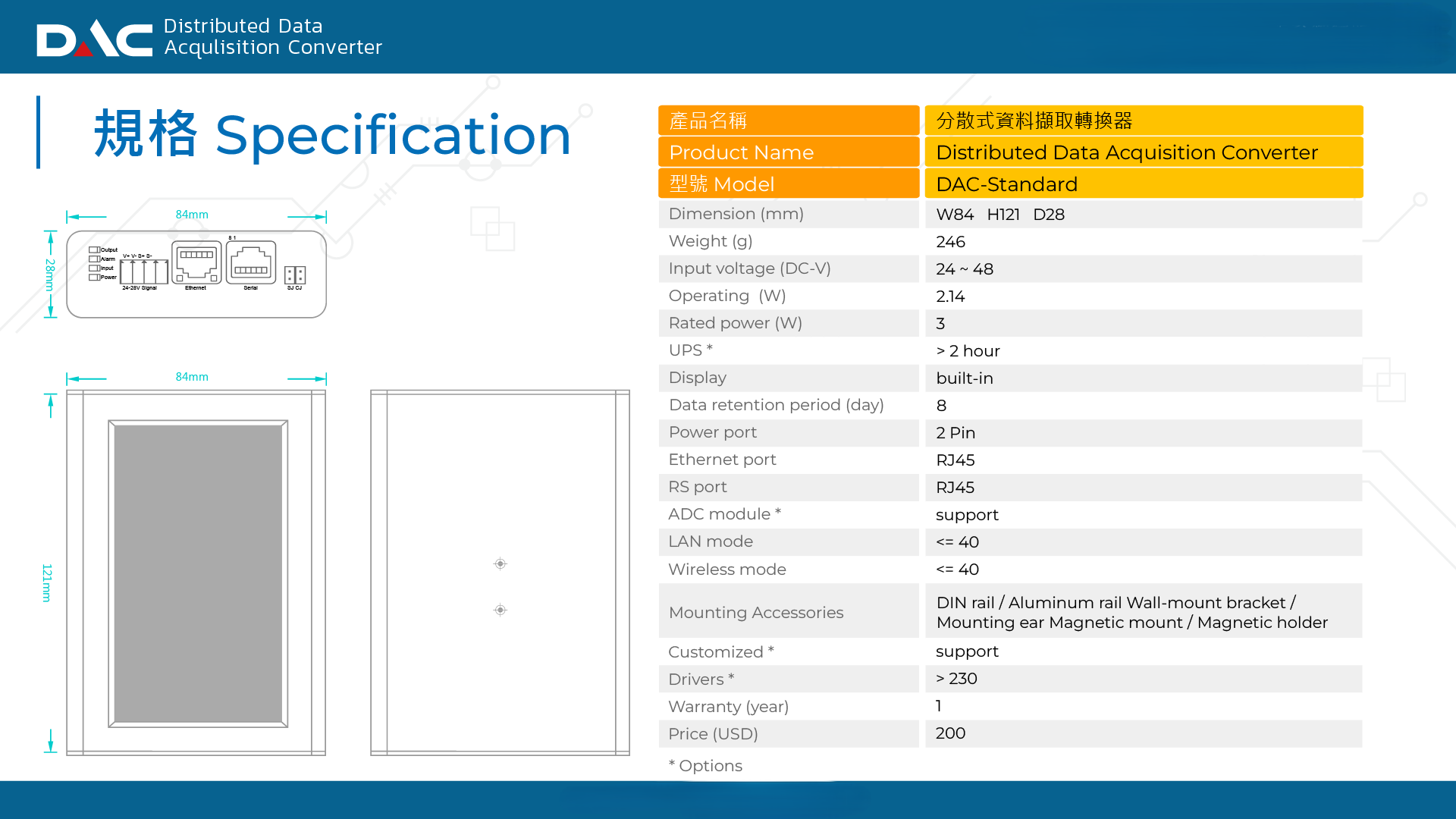 分布式数据撷取转换器 分布式数据撷取转换器 (Distributed Data Acquisition Converter) 专为半导体及高科技产业打造,透过分布式架构设计, 可直接于各制程站点进行数据撷取与转换, 无须倚赖复杂的集中式系统, 有效降低布建成本与维护负担。 其独立运作能力, 确保每一单元在异常或网络中断时, 仍能持续记录与处理数据, 提升系统的稳定性与可靠性。 产品支持多种通讯协议与感测接口, 能快速整合既有设备, 协助客户加速导入智能化制造。 凭借高弹性与可扩充性, 分布式数据撷取转换器不仅能节省整体营运成本, 更为企业建立高效率、低风险的IoT基础架构。 档案下载 回上一页