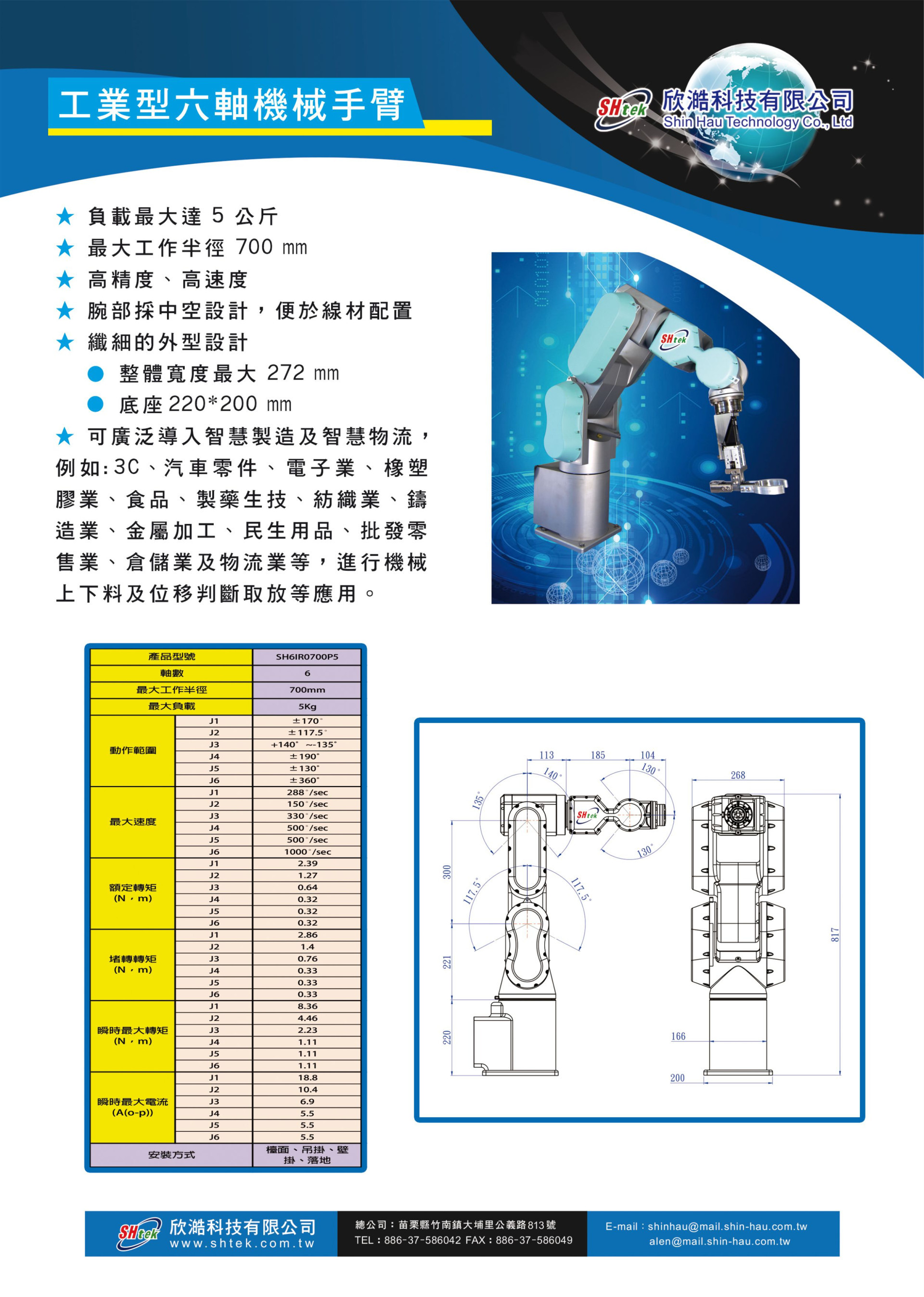 欣澔科技的六轴工业机器人手臂可广泛应用于智能制造及智能物流领域,包括应用于3C产品、汽车零件、电子业、橡塑料业、食品加工、制药生物技术、纺织业、铁器制造业、金属加工、民生用品、批发零售业、仓储业和物流业等。凭借其精确的机械上下料和位移判断能力,欣澔科技自主研发机器人手臂为生产线带来全新的革命性应用。
