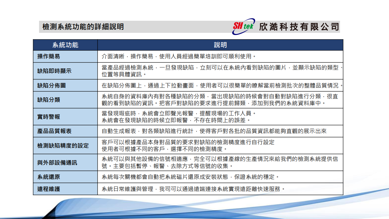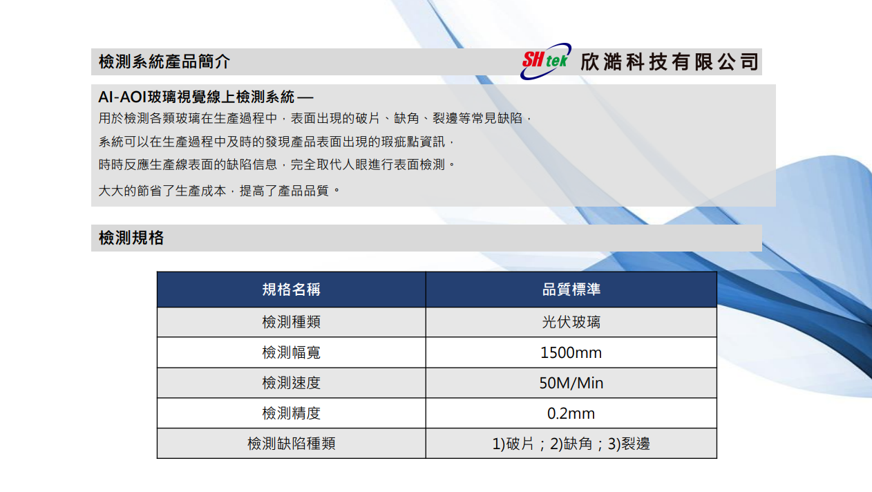 AI-AOI玻璃破片在線檢查系統 AI-AOI玻璃視覺線上檢測系統用於檢測各類玻璃在生產過程中表面出現的破片、缺角、裂邊等常見缺陷,系統可以在生產過程中,及時的發現產品表面出現的瑕疵資訊,結合AI智慧運算能力,自動判別及歸類缺陷種類,時時反映產品的缺陷訊息,完全取代人眼進行表面檢測及判讀,大大節省了生產成本,同時提高產品品質。 Download Back